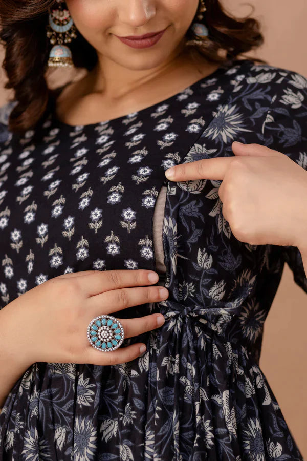 Feeding Dress With Breathable Fabric : Maternity Dress made of breathable cotton fabric that allows air circulation and keeps you cool all day long. This Anarkali Gown Style Western Dress is lightweight, breathable, stretchy & incredibly soft to the skin.