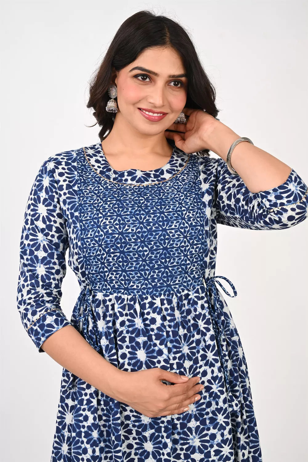 This is a white color Maternity Kurti Cum Feeding Gown with navy blue flower motifs printed on it, also this kurti has two invisible side chains for feeding. This nursing gown is been made in Pure Cotton fabric. Its has round neck & 3/4th sleeves. This maternity kurti has side Tie-Ups to provide maximum support and shape, also this stylish dress can be worn pre &; post pregnancy.