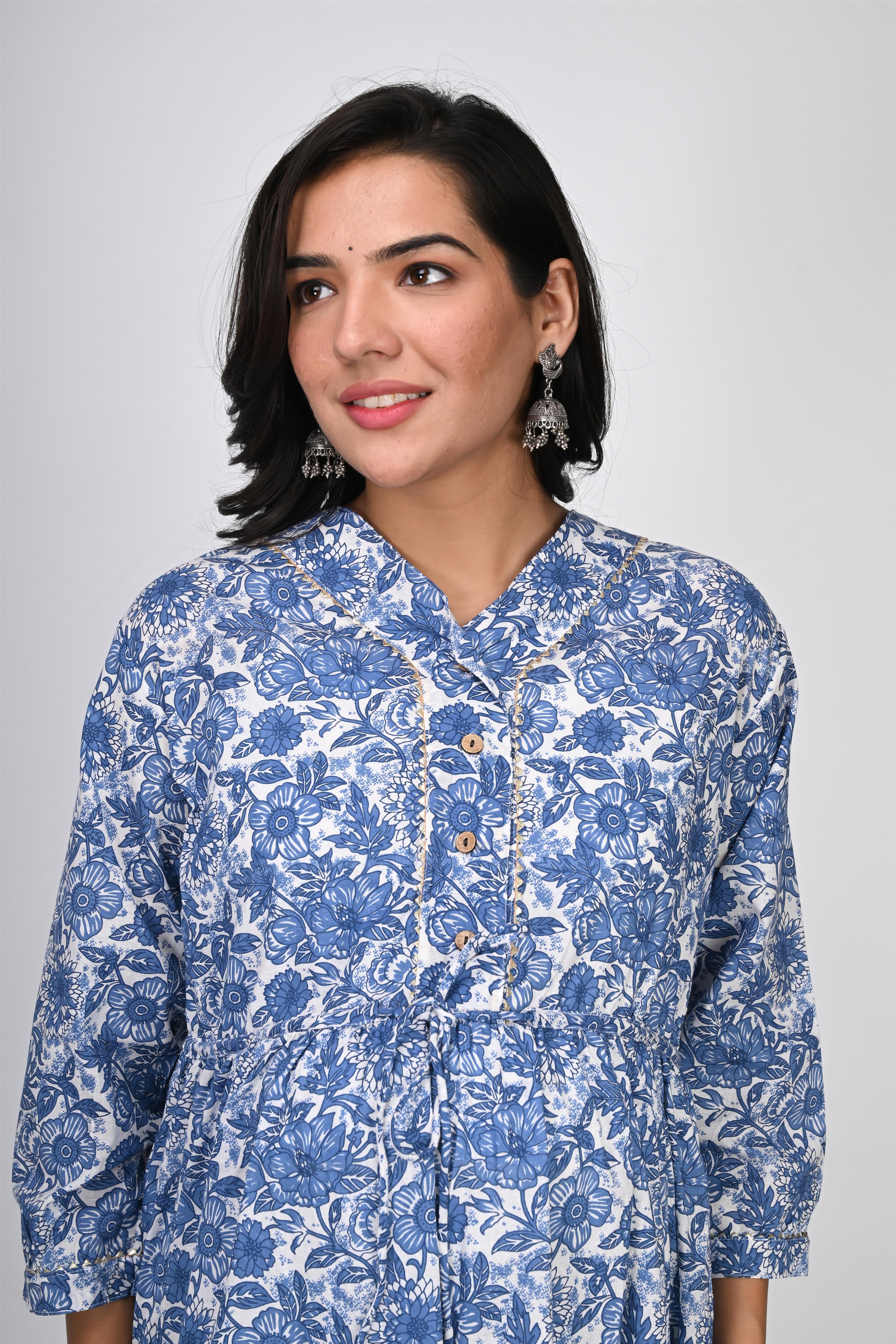 This White Maternity Dress cum maternity kurti has Blue Flower Motifs Printed on it, made in Pure Cotton. This maternity gown has V Neck with Front Button for Feeding. It has long half sleeves. This maternity kurti has Front Tie-Ups to provide maximum support and shape, also this stylish dress can be worn pre & post pregnancy.