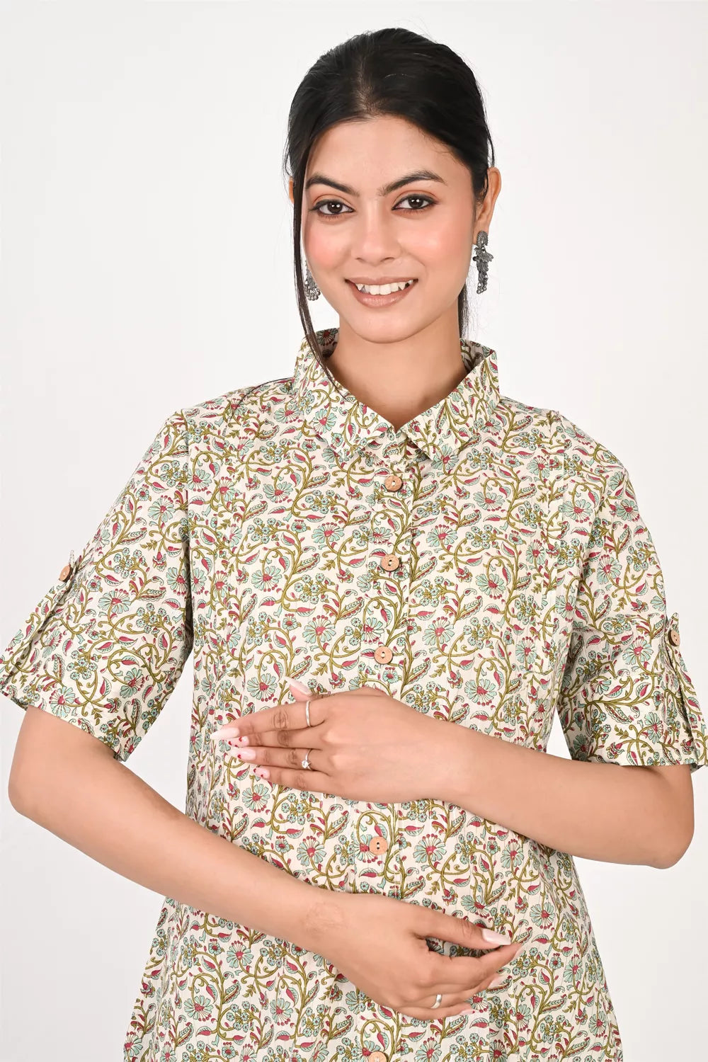 Elevate your maternity wardrobe with this chic Co-ord set featuring a sophisticated Collar-Neck, Short Sleeves and handy pockets for convenience. This is Feeding Co-ord Set with Blue and Olive Floral printed on it. This Co-ord set is been made in Pure Cotton fabric. This maternity Matching Set can be worn pre &; post pregnancy.