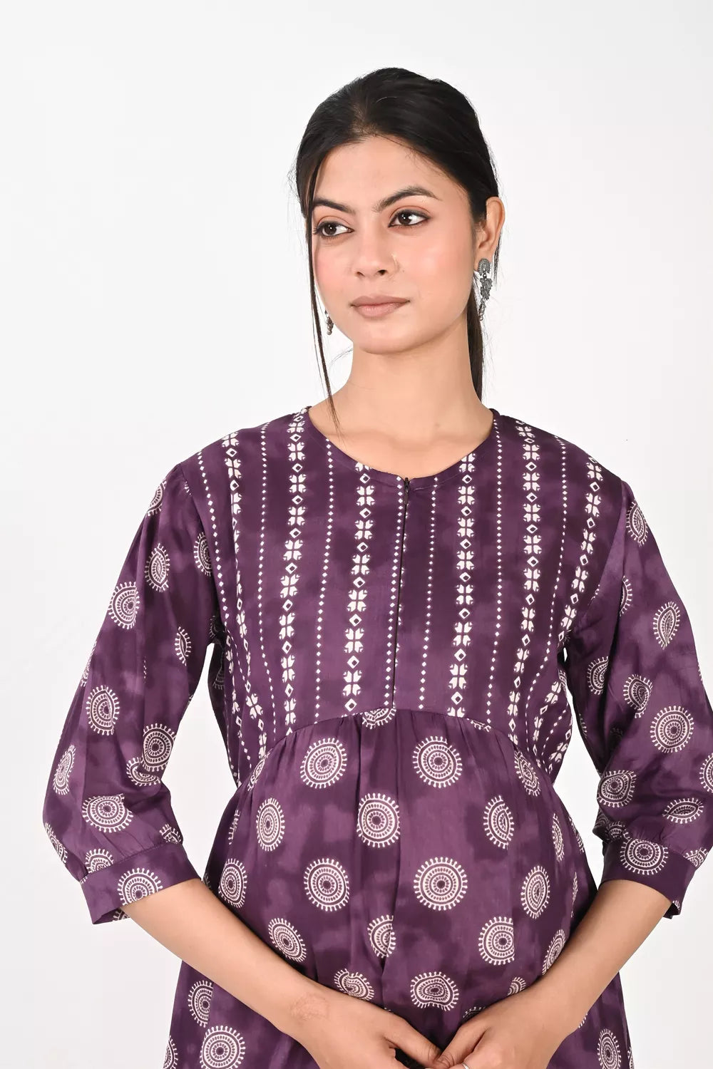 This maternity cum feeding kurti in a lovely purple hue features a front chain opening for convenient nursing and a stylish white geometric print. Made from pure cotton, the kurti has rounded neckline and 3/4th sleeves. It also offers back tie-ups for extra support and shaping, making it a perfect choice for both pre and post-pregnancy wear.