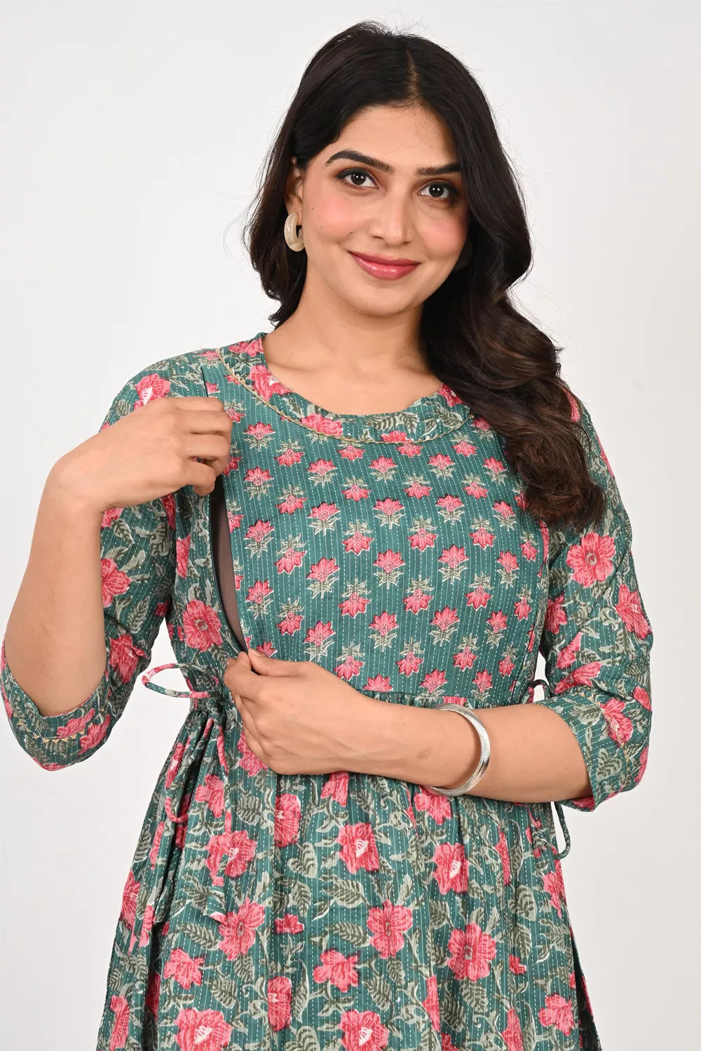 This is a steel grey color maternity kurti cum feeding gown with pinkish floral motifs printed on it, also this kurti has two invisible side chains for feeding. This nursing gown is been made in Pure Cotton cambric Khatta fabric. Its has round neck & 3/4th sleeves. This maternity kurti has back side Tie-Ups to provide maximum support and shape, also this stylish dress can be worn pre &; post pregnancy.