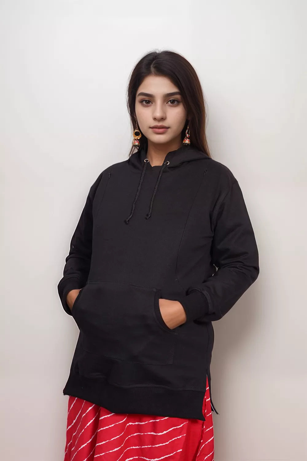 This maternity and nursing hoodie features premium cotton fleece material and two invisible side zips for easy feeding access. It boasts a comfortable, relaxed sized hood and a convenient front kangaroo pocket. Additionally, the solid color design comes with a side slit to accommodate a growing bump. This versatile hoodie can be worn both during and after pregnancy. It is made in relaxed fitting, so that you can accomodate any inner(clothing) warmers for winters.