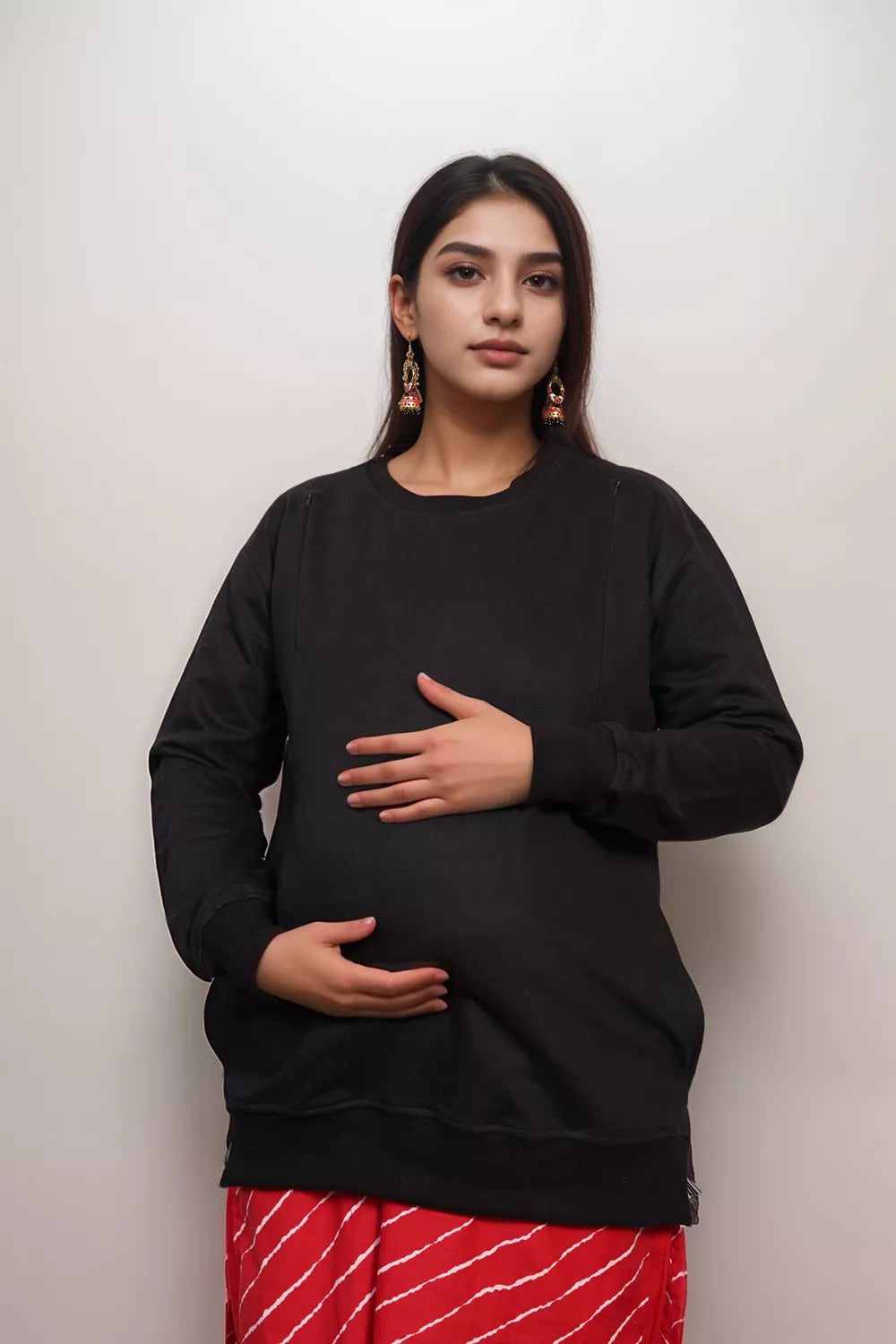 This maternity and nursing sweatshirt is made with premium cotton fleece material and two side zips for easy feeding access. Its comfortable, relaxed fit includes two side pockets and a side slit for a growing bump. The solid color design makes it perfect for both pregnancy and postpartum wear. Its relaxed fit allows for layering with warm inner clothing during colder months.