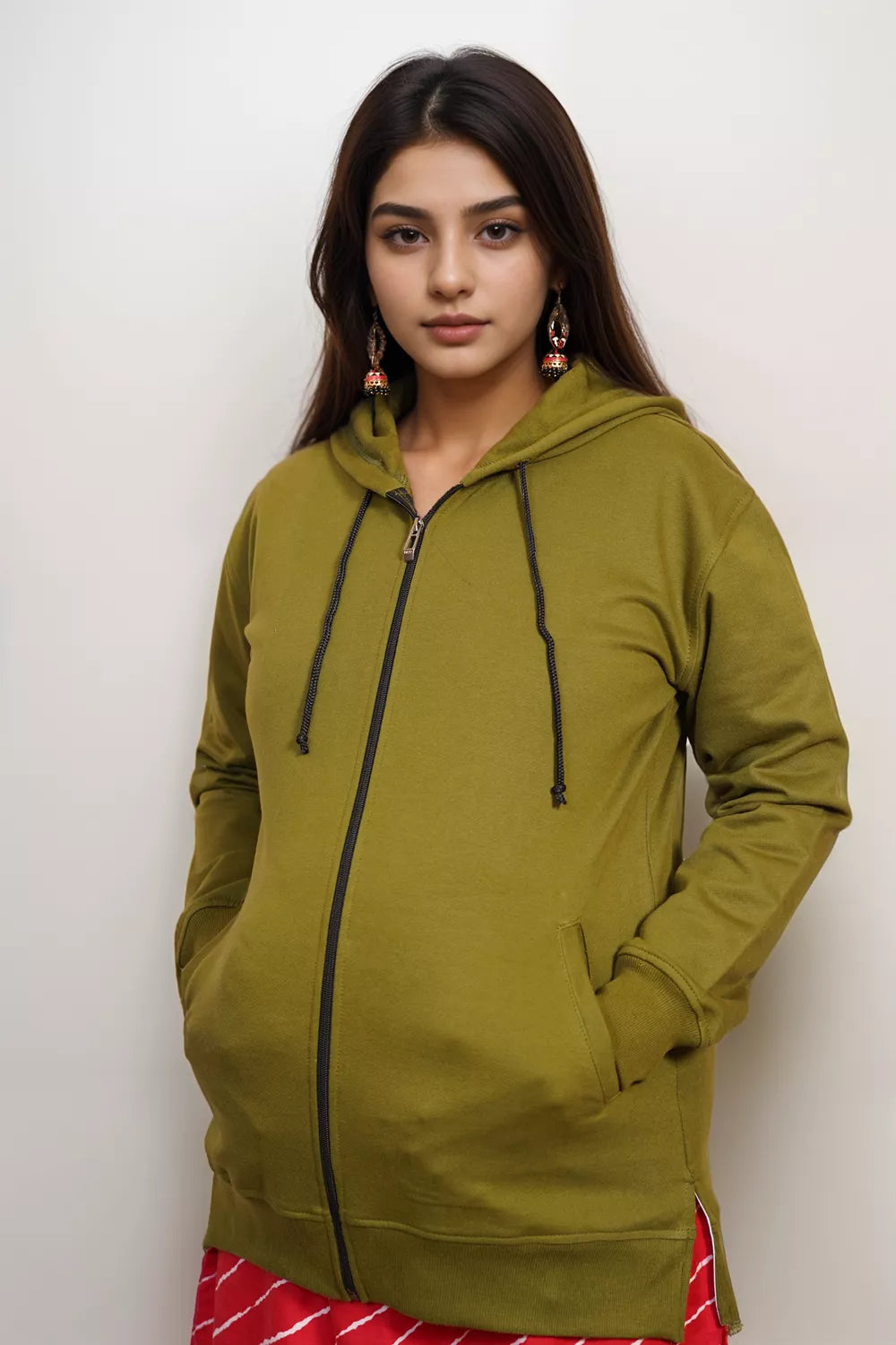 This high-quality maternity and nursing hoodie is composed of top-grade cotton fleece and features a convenient front zipper for simple feeding. Its roomy fit includes two pockets and a slit on the side to accommodate a growing bump. The solid olive green color makes it versatile for both pregnancy and postpartum wear, while also allowing for layering with warmer clothing in colder seasons.