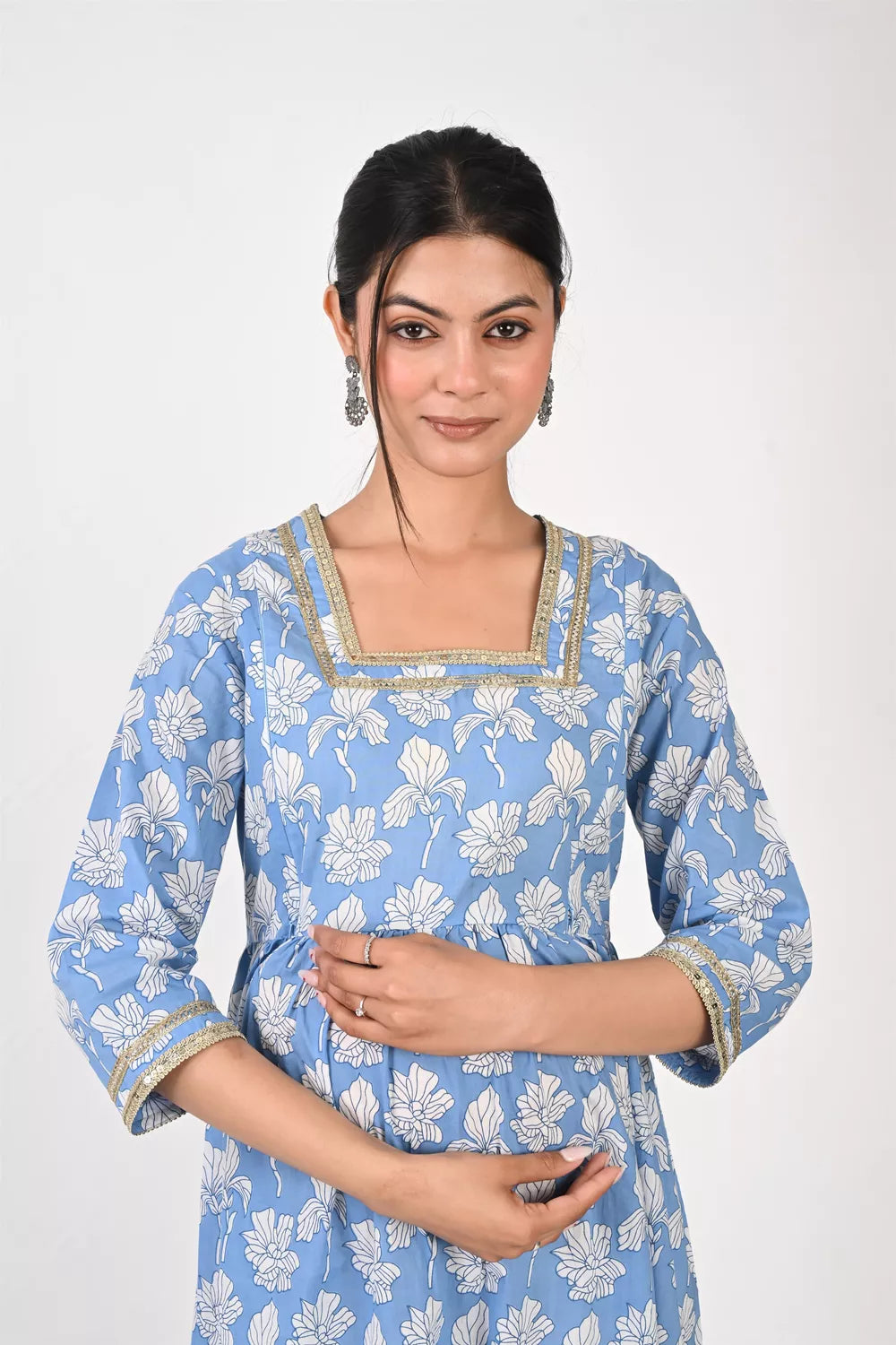 This light blue maternity kurti features a floral print and invisible side chains for easy feeding. Made from pure cotton fabric, this nursing gown has a square neck and 3/4th sleeves for comfort. The back side Tie-Ups offer maximum support and shape, while making this a stylish option for both pre and post pregnancy wear.