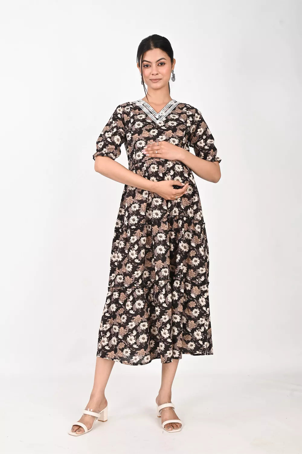 This is a black color V neck Maternity Kurti Cum Feeding Gown with white & brown flowers printed on it, also this kurti has two invisible side chains for feeding. This nursing gown is been made in Pure Cotton fabric. Its has v neck & short elasyicated sleeves. This maternity kurti has back side Tie-Ups to provide maximum support and shape, also this stylish dress can be worn pre &; post pregnancy.